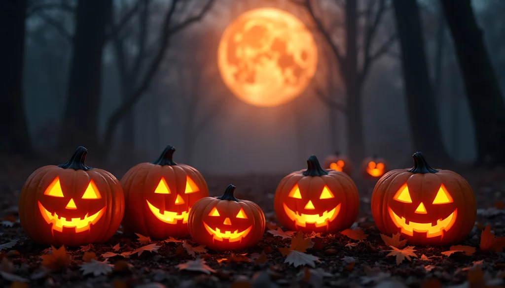 Glowing carved pumpkins under a moonlit sky, surrounded by misty trees — eerie yet peaceful.