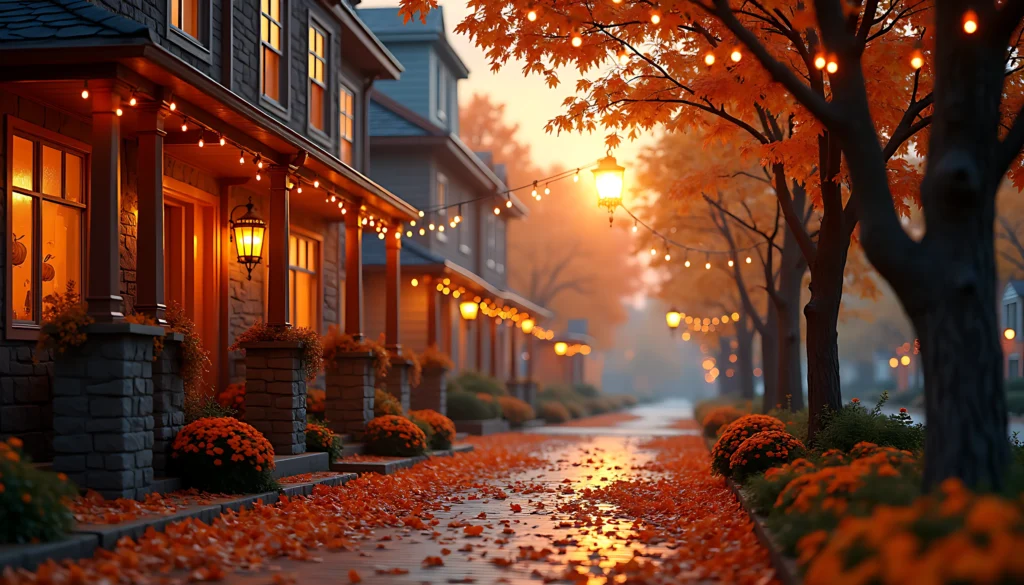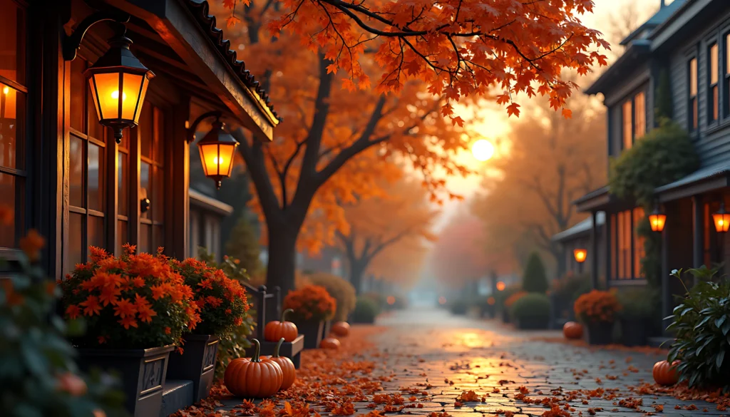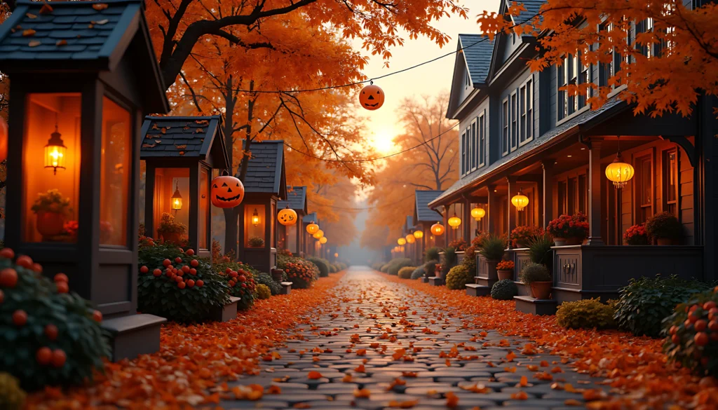 Orange leaves, flickering streetlights, and vintage Halloween decor.