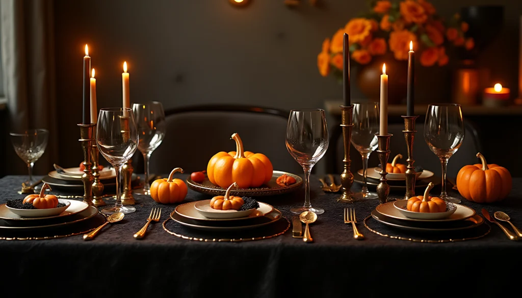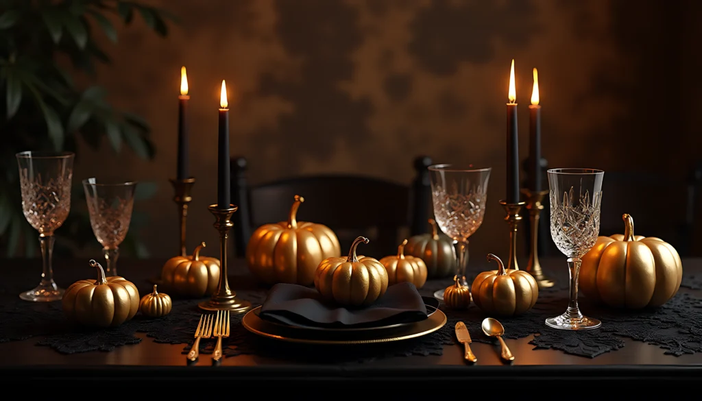 Gold pumpkins, lace cloth, and candlelight — classy Halloween aesthetic.