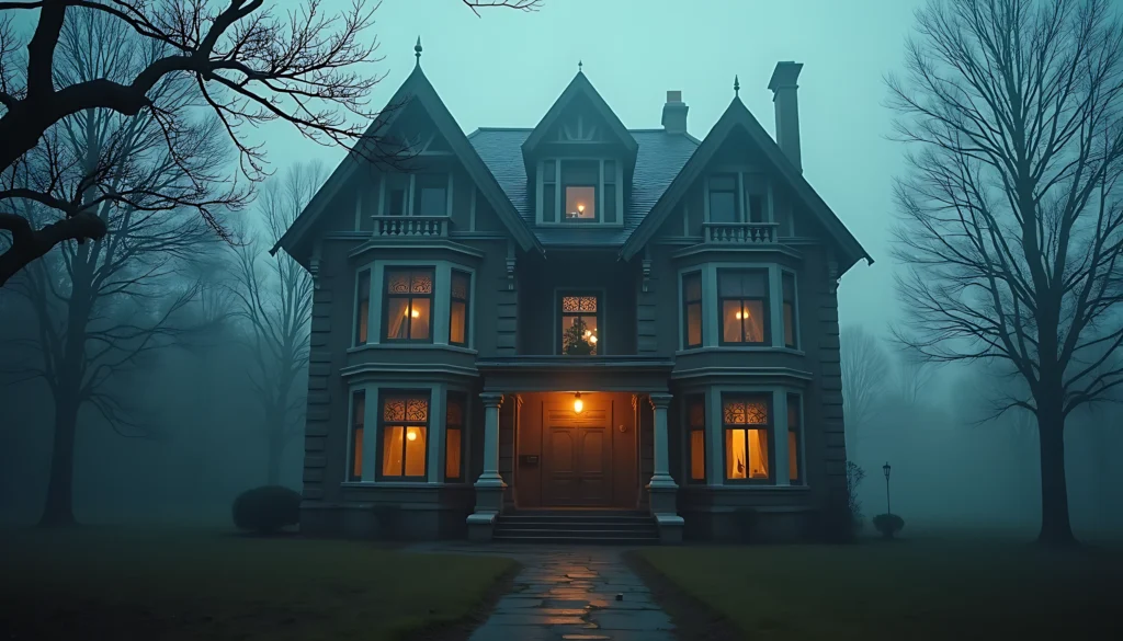 A mysterious old mansion glowing softly in the fog — spooky yet elegant.