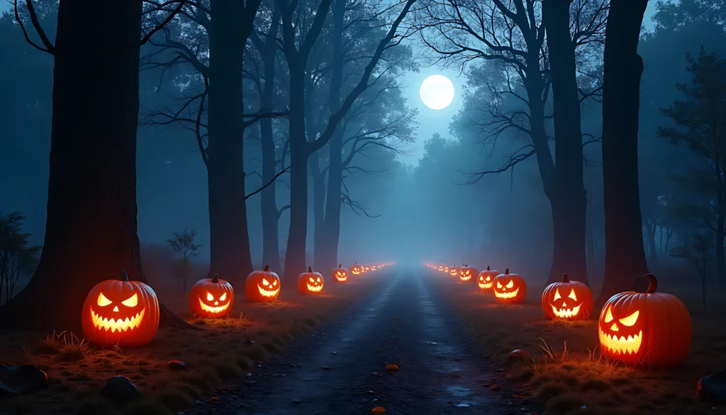 A foggy forest lined with glowing jack-o’-lanterns, perfect for dark autumn lovers.